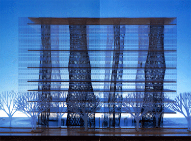 面出薫と伊東豊雄の対談 (光の建築をめざしてー「風の塔」から「せんだいメディアテーク」まで TOTO出版) の中で、ブルーモーメンントという言葉が出てくる。簡単に言うと、昼と夜の間にある短い瞬間。面出さんの説明を拝借すると、「日没の直後、地平線に沈んだ太陽の光が天空に拡散して青い波長の光に包まれる瞬間。その青の瞬間というのは、胸騒ぎの時間、とても不安定な情緒になるのですが、気持ちが吸い込まれるような美しい時間です。」さらに、メモによるとジャンヌーベルさんは、建築家は昼と夜の二種類の図面を書けと言っております。伊東さんは、昼と夜の交差する時間に現れる建築は、その建築が美しいのかを見るひとつのものさしである。というようなことを言っています。メディアテークのコンペ時の衝撃の模型は、その背景が目に見えて表現されたものだと思います。ブルーモーメントに輝く建築を目指すというのは、ひとつの美意識として頼もしいものだと、コンペ案を思いだし、トッズを見て (パークドームも見て) 思いました。そういや、横浜の調査してたのに、風の塔見てねーや。今度行こーっと。
